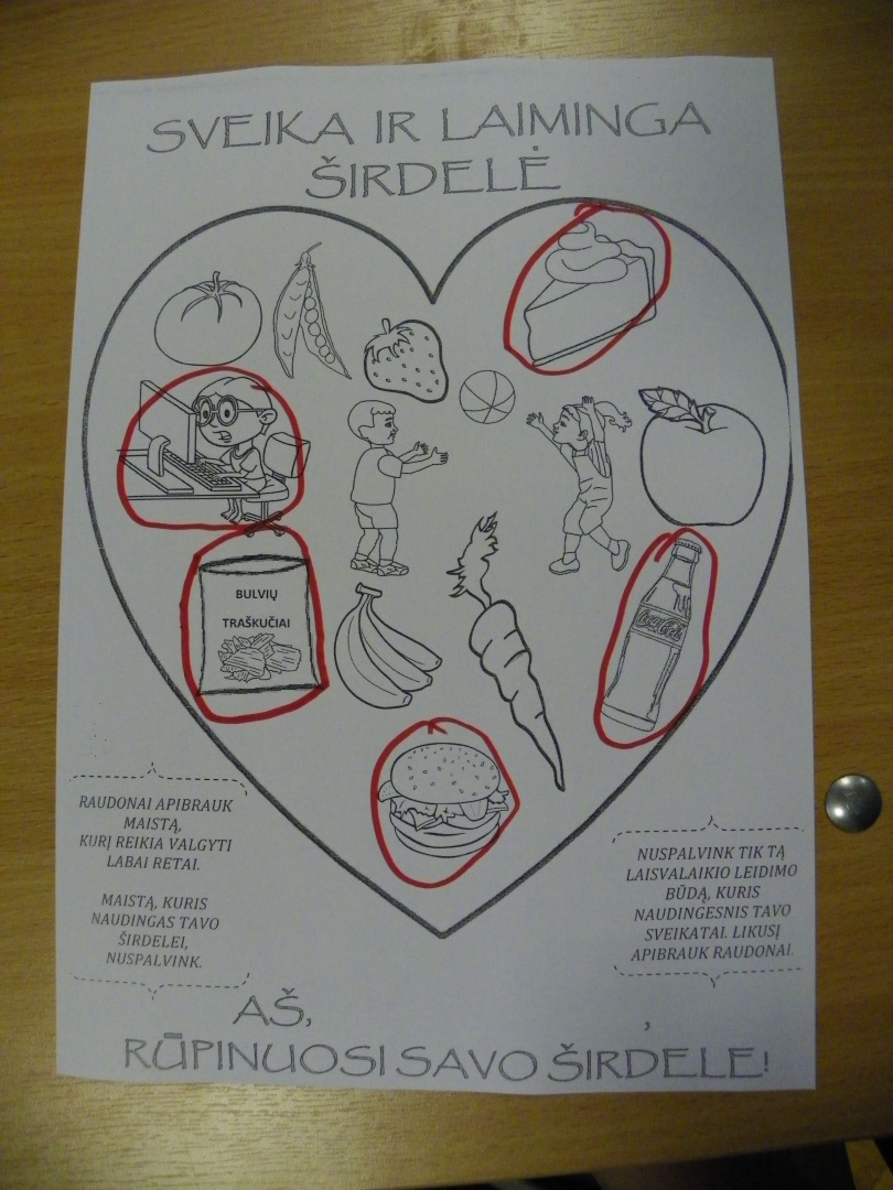 Rugsėjo 24 d. gimnazijos 1 klasėje vyko integruota pasaulio pažinimo pamoka, skirta pasaulinei širdies dienai pažymėti. Visuomenės sveikatos priežiūros specialistė Gintarė Jasiulytė papasakojo vaikams apie širdelę, kad tai yra raumuo, kurį reikia mankštinti. O tai padaryti galima daug judant, sportuojant. Vaikai atliko bandymą: klausėsi savo širdelės plakimo sėdėdami suoluose – širdelė plakė lėtai, po to pažingsniavo, pašokinėjo ir vėl pasiklausė širdelės plakimo. Šį kartą širdelė plakė žymiai greičiau. Vaikai sužinojo, kad aktyviai judant ir širdelė dirba greičiau. Taip pat širdelė mėgsta sveiką maistą: košes, sultis, vaisius, daržoves… Mokiniai gautuose lapuose atliko užduotį. Jie įsidėmėjo, kokie produktai labiausiai kenkia sveikatai, ir pasižadėjo jų vartoti kuo mažiau.