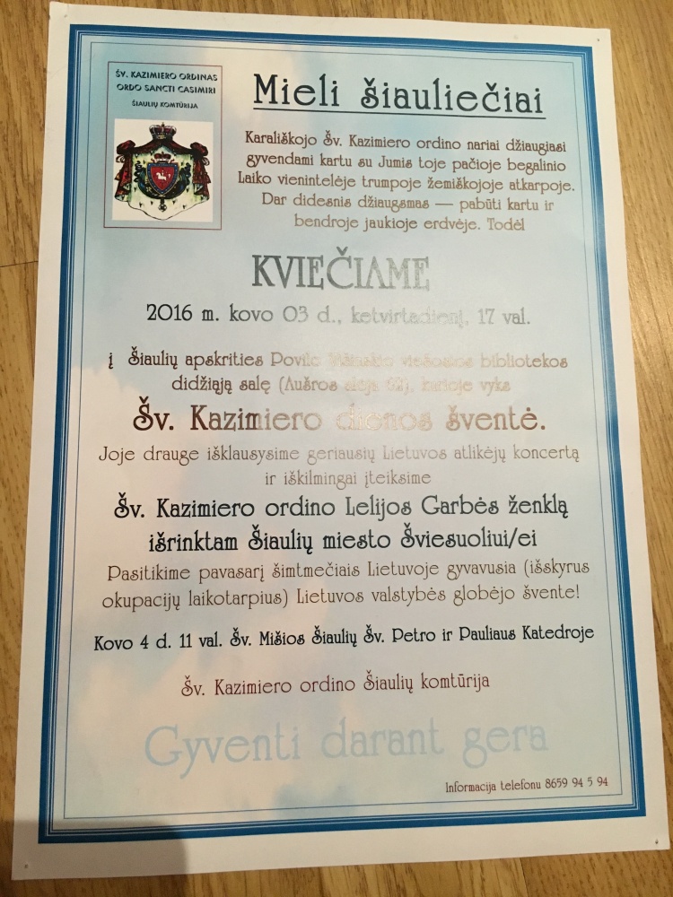 Šiais metais įsteigta nauja nominacija „Šiaulių miesto jaunajam/ai šviesuoliui/ei“. Šv. Kazimiero ordino Šiaulių komtūrija šį apdovanojimą skyrė mūsų gimnazijos papildomo mokymo skyriaus mokinei smuikininkei Liepai Jurgutavičiūtei. Jai įteikta unikali Šv. Kazimiero „Angelo globėjo“ statulėlė. Salė kvepėjo lelijų žiedais, skambėjo sveikinimai ir linkėjimai. Šventiniame koncerte skambėjo daug klasikinės muzikos, kurią atliko D. Tiškovaitė, L. Jurgutavičiūtė ir ansamblis „Ars vivo“. Koncertą parengė, akompanavo ir vedė Sigitas Vaičiulionis.