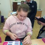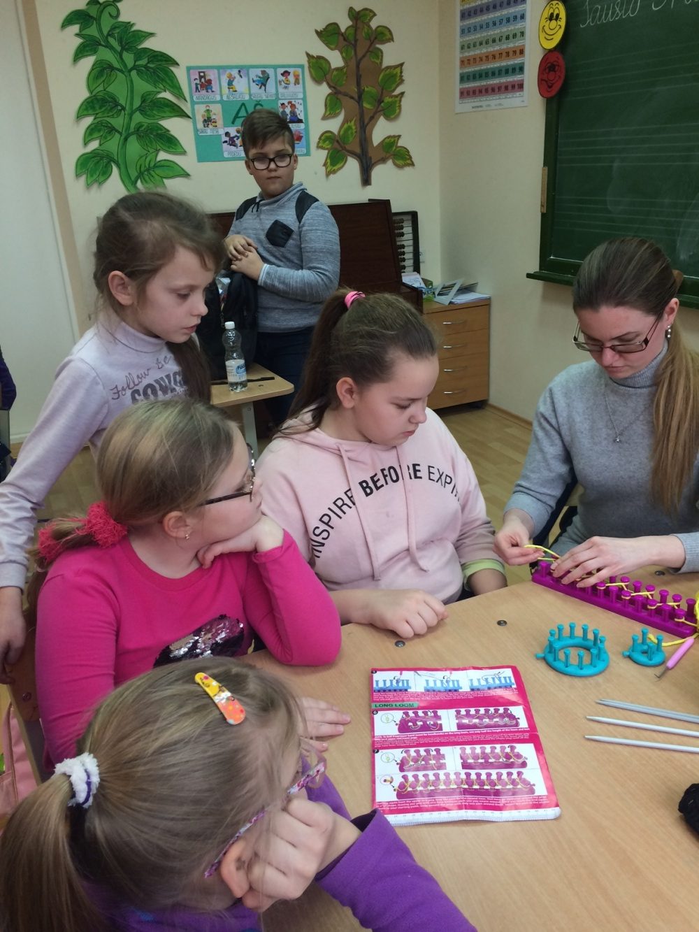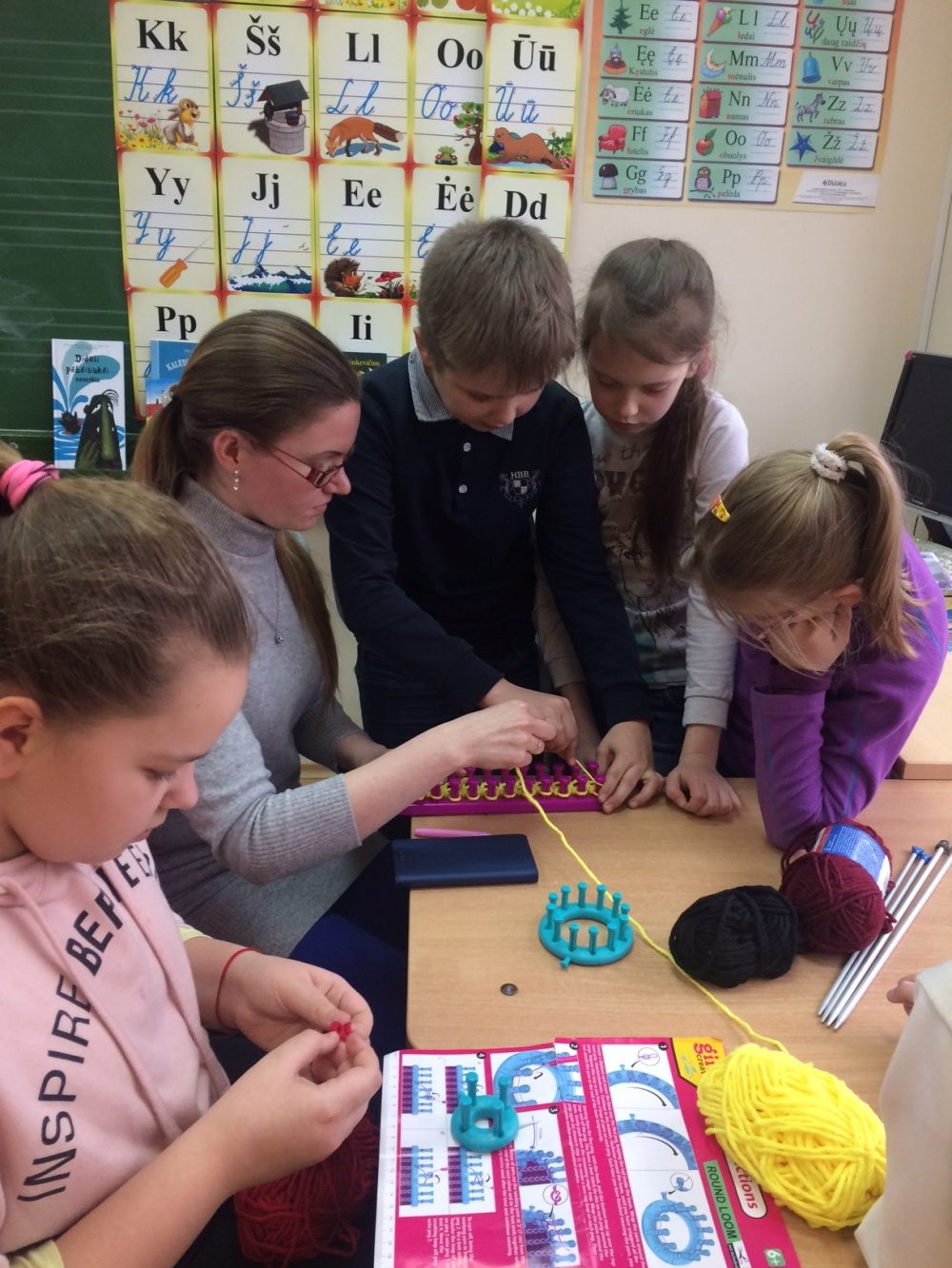 Jovita Rezgevičienė puikiai neria, mezga virbalais, domisi netradicinėmis rankdarbių technikomis, tad mielai sutiko pasidalinti savo kūrybinėmis idėjomis. Užsiėmimo metu vaikus supažindino su nesudėtingomis staklytėmis, kurių pagalba galima nusimegzti riešines, juosteles, šalikus. Šios staklytės gali atstoti įprastus virbalus.