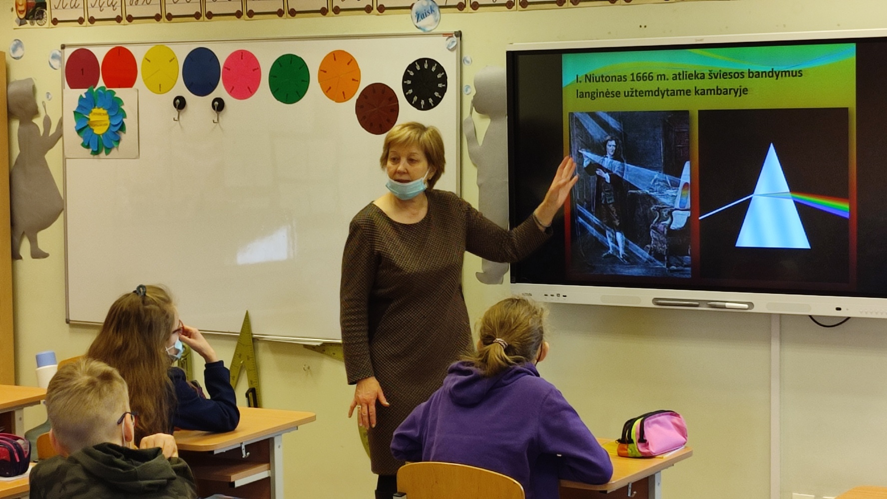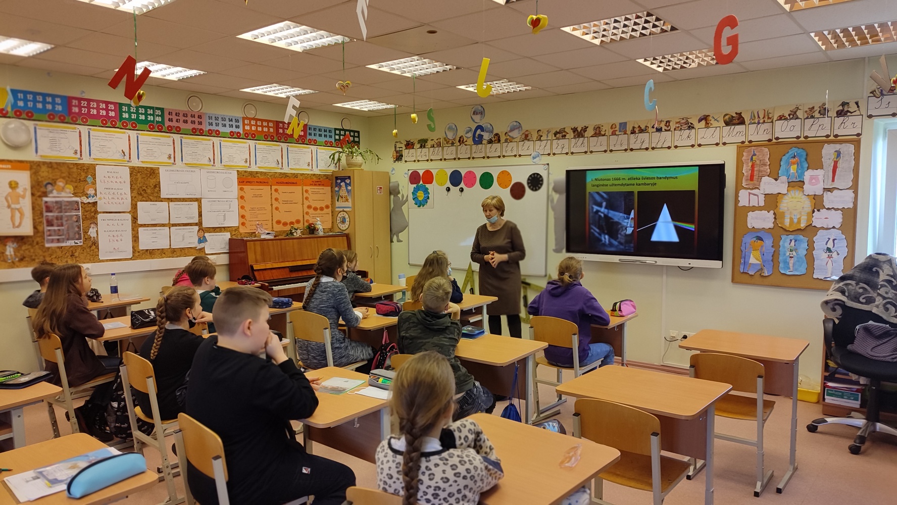 Kovo 25 d. 4 klasės mokiniams vyko integruota lietuvių kalbos ir pasaulio pažinimo pamoka „Žemės spalvos. Vaivorykštė“. Šios pamokos tikslas ‒ suteikti žinių apie šviesos spektrą ir jo susidarymą, išsiaiškinti vaivorykštės vaizdinio prasmę įvairių šalių tautosakoje bei mitologijoje.