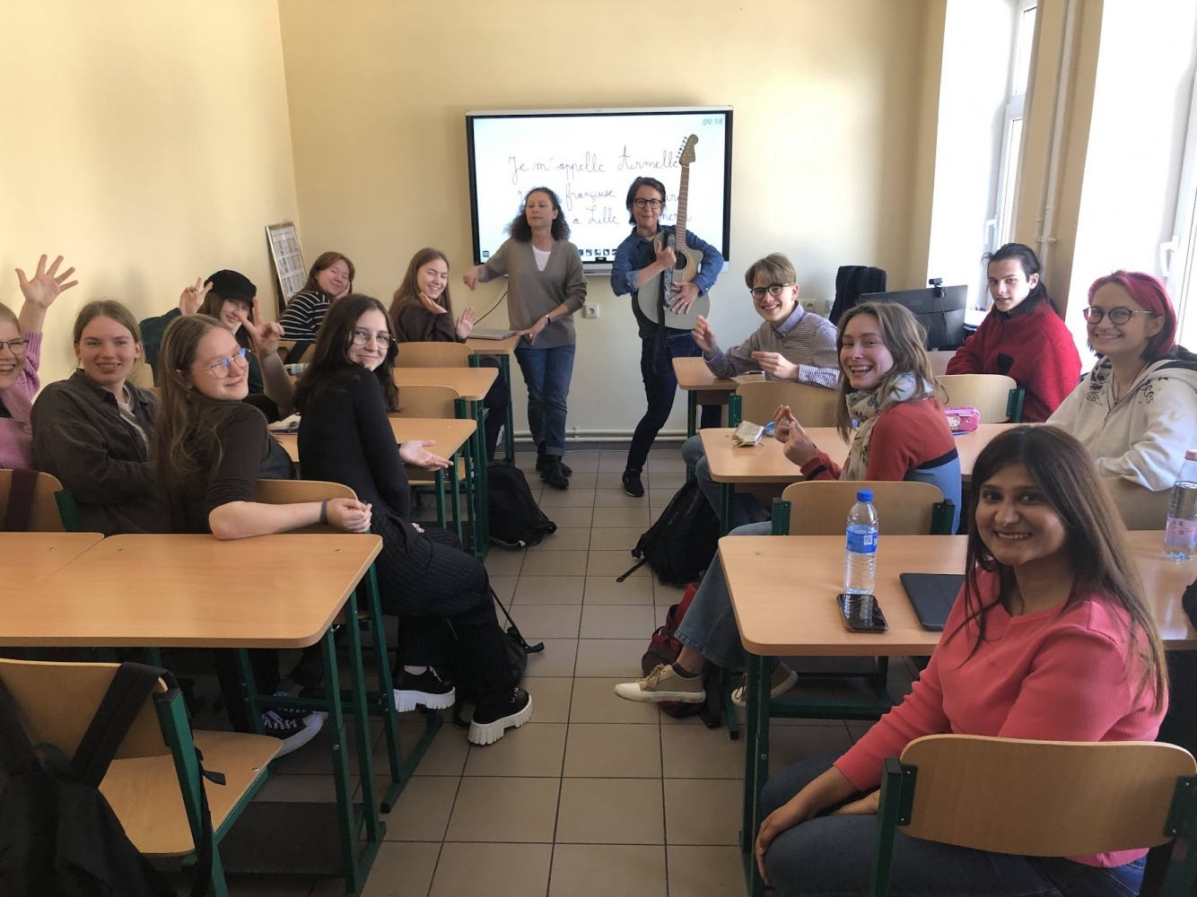 Mokytojos Zitos Gramailienės iniciatyva partneriai iš Prancūzijos II gimnazijos klasių mokinius supažindino su prancūzų kalbos pradmenimis, tarimo ypatybėmis. Svečiams puikų įspūdį paliko mūsų mokinių šiltas bendravimas, pozityvus įsitraukimas į veiklą dainuojant prancūzišką dainą.