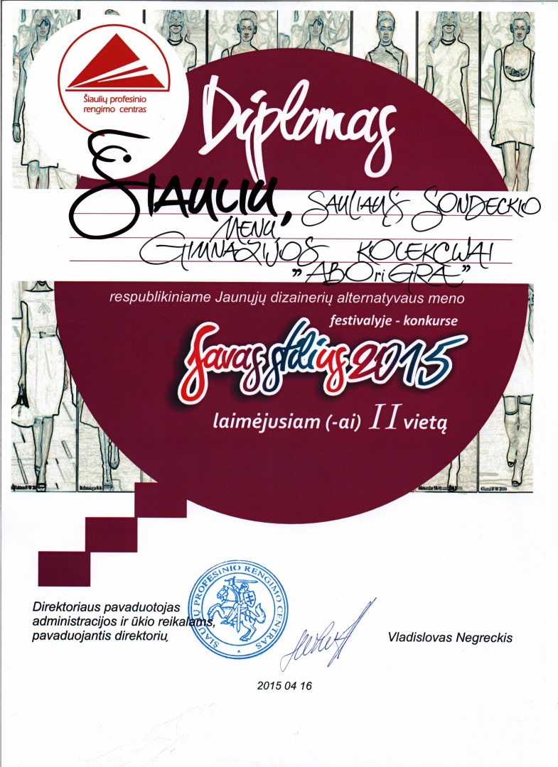 Mūsų gimnazijos mokiniai balandžio 16 d. šauniai pasirodė respublikiniame Jaunųjų dizainerių alternatyvaus meno festivalyje-konkurse „Savas stilius 2015“, kurį organizavo Šiaulių profesinio rengimo centro Buitinių paslaugų skyrius. Mūsų avangardinę kolekciją „ABOriGRA“ (mokytojos Loreta Narušienė ir Justina Šaltė) komisija įvertino II laipsnio diplomu. Konkurso „Geriausias modelis 2015“ rinkimuose 10 klasės mokinė Greta Gelžinytė prisistatė su savo stiliaus Prete-Parte džinsiniu kostiumu bei tautiniu kostiumu, ji pelnė III vietą. Renginį vedė 11 klasės mokinys Kornelijus Stučkus, grojo gimnazijos muzikinė grupė „Gitaristai ant platformos“.